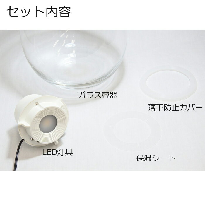 ) ※ガラス容器とLEDライトの組み立ては、ガラス容器→落下防止カバー→LED灯具→ACアダプターです。