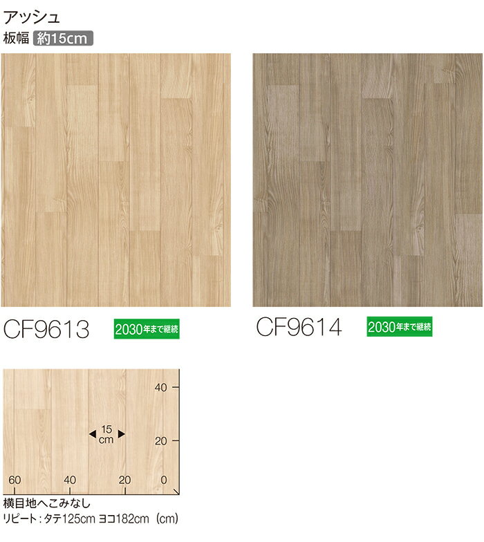 ハサミやカッターで簡単に切れるので施工も楽々! ◆サイズ:182cm幅 (1m単位で切売り) ◆素材:塩化ビニール ◆厚み:約1.8mm ◆長さ:最長30m ◆重量:長さ1mあたり約1.5kg ◆機能:抗菌、防カビ、JISマーク ◆その他:日本製 ◆カラー:[木目調] CF9405 CF9406 CF9407 ◆リピート:タテ125cm ヨコ182cm ◆板幅:約15cm メーカー希望小売価格はメーカーサイトに基づいて掲載しています 東リ クッションフロア (R) 切売り 約182cm幅アッシュ CF9405〜9407